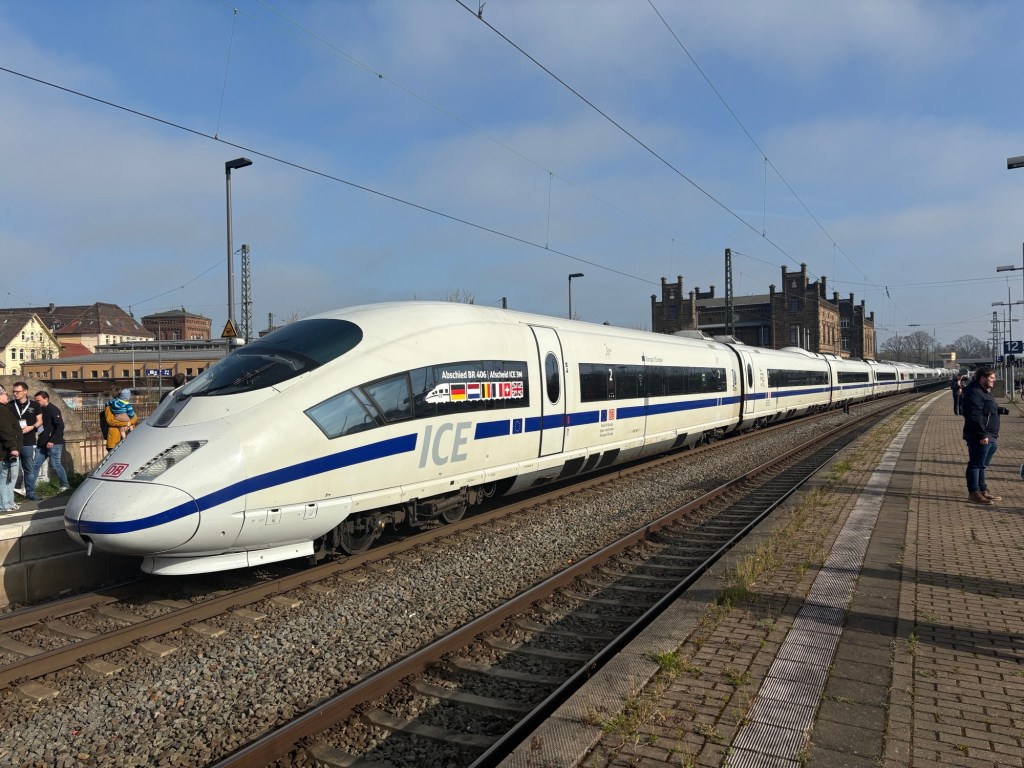 Es kamen übrigens auch zwei ganz spezielle Züge zum Einsatz: Der 406 001-8 „Europa“ frei zugänglich für alle. Und der 406 051-3 getauft auf den Namen „Amsterdam“. Der fuhr exklusiv für Mitarbeitende von DB Fernverkehr und NS International. Funfact: Der Amsterdam-Zug trägt bis heute NS-Logos, weil er mal einer von vier 406ern war, die NS International gehört haben. Heute gehört er längst wieder der DB, aber die Logos sind geblieben. Und genau diese beiden Züge 406 001-8 und 406 051-3 fuhren jetzt auch bei der Abschiedsfahrt mit.