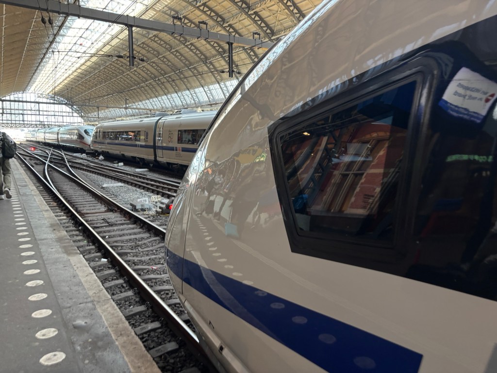 Danach kam ein bisschen Umleitungs-Action: Wegen Bauarbeiten ging’s nicht direkt nach Amsterdam Centraal, sondern erst über Diemen Zuid und dann weiter nach Amsterdam Bijlmer ArenA. Dort fand sogar ein Fahrtrichtungswechsel statt was bei einem ICE immer ein kleiner Showact ist. Leider konnte man dort nicht aussteigen, der Zug war schlicht zu lang für den Bahnsteig.